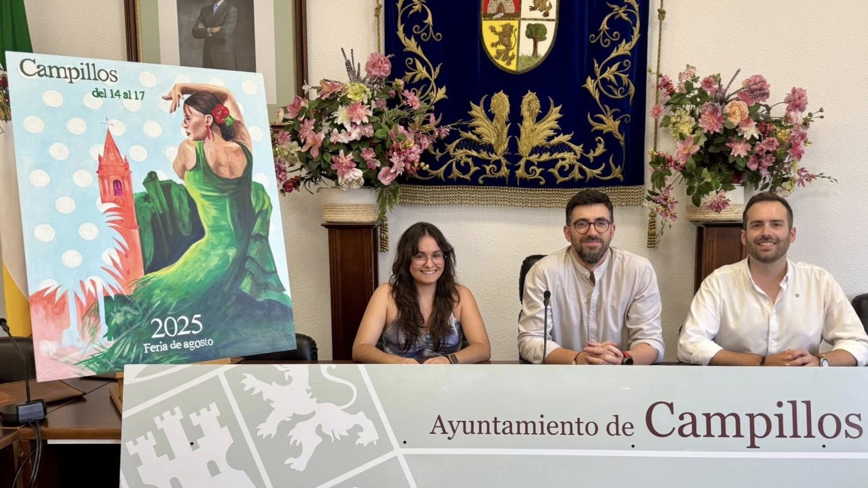 Esperanza Gallardo, Daniel Gómez y Adrián Cañamero en la presentación del cartel de la Feria de Agosto de Campillos