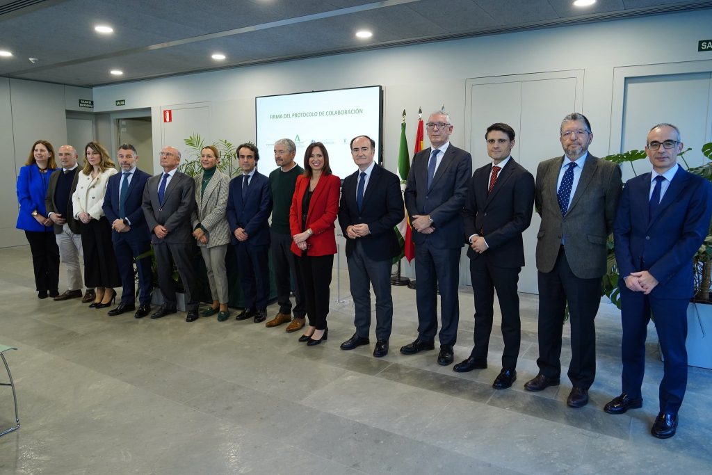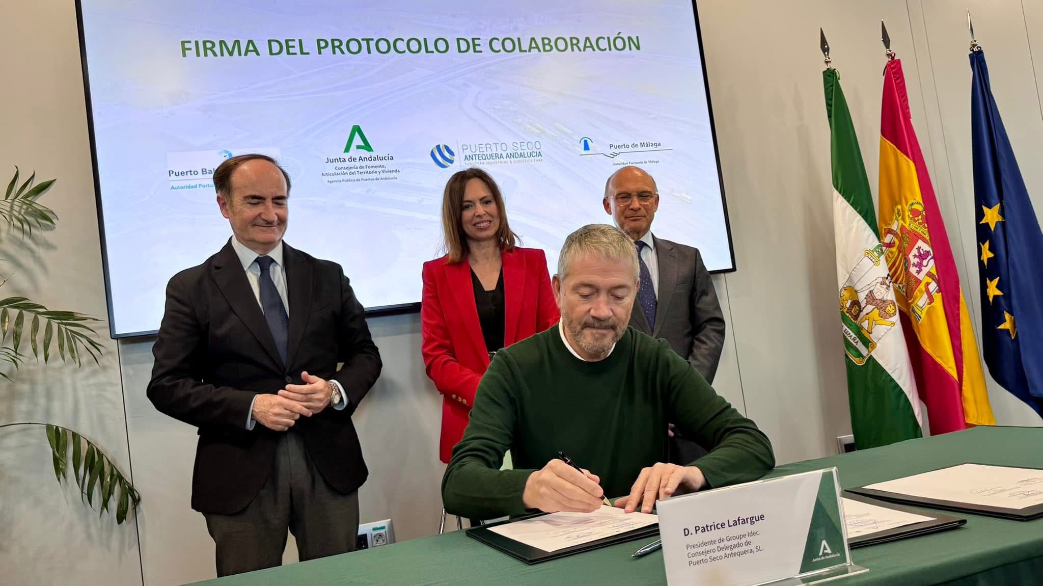 La consejera de Fomento, Articulación del Territorio y Vivienda de la Junta de Andalucía, Rocío Díaz, ha firmado este jueves un acuerdo de colaboración con el presidente y consejero delegado de la Sociedad Puerto Seco de Antequera, Patrice Lafargue, y los los presidentes de la autoridades portuarias de Bahía de Algeciras, Gerardo Landaluce, y Málaga, Carlos Rubio, para reconocer el interés común en el impulso del Área Logística de Antequera y trazar un modelo común centrado en la realización de proyectos conjuntos de logística portuaria internacional.
