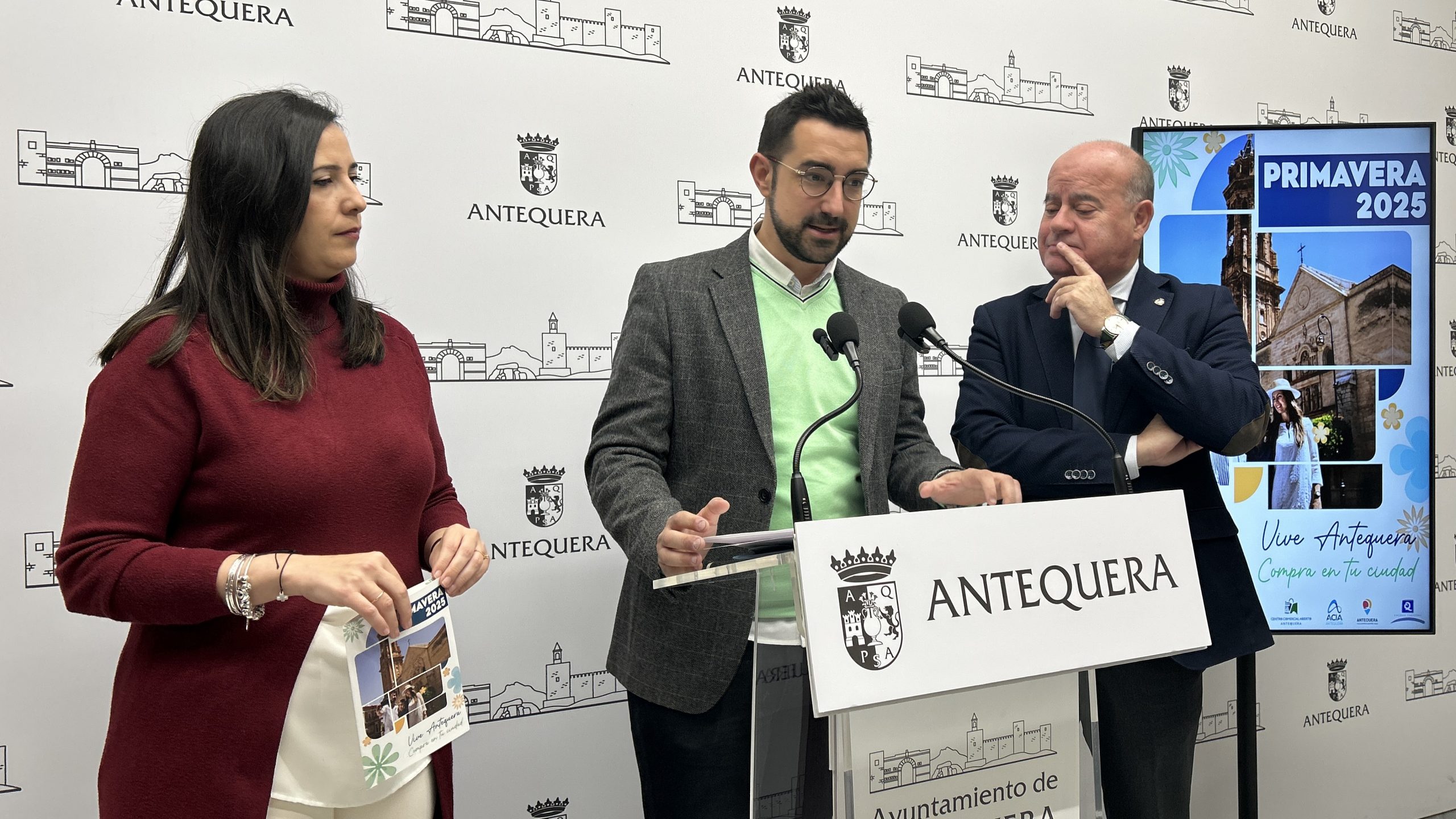 Manolo Barón, Ana Cebrián y Jorge del Pino, en la presentación de la campaña comercial de primavera de Antequera (marzo 2025)