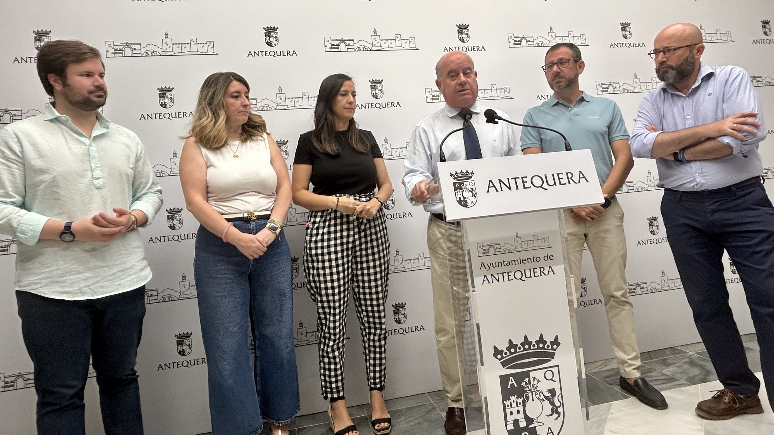 El alcalde Manolo Barón, junto a parte del equipo de Gobierno, en una comparecencia sobre asuntos del pleno del Ayuntamiento de Antequera (julio 2025)